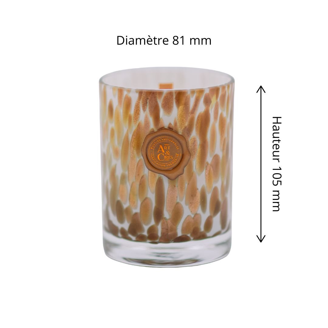 Conçue avec de la cire naturelle 100% végétale provenant de plantations durables, la bougie glitter se distingue par sa cire cristalline. Contrairement aux bougies traditionnelles, cette caractéristique lui donne un effet élégant qui sublime votre intérieur. L’association du verre avec une sélection minutieuse de matières premières fait de ce produit un choix haut de gamme pour les amateurs de décoration raffinée.