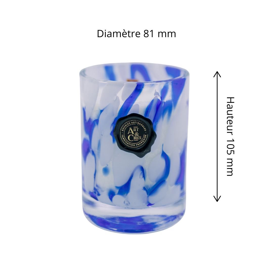 Chaque bougie est entièrement artisanale. Du verre soufflé à la bouche à son remplissage effectué dans notre atelier Art et Cires, chaque étape de sa création témoigne d’un savoir-faire exceptionnel. Le modèle Granulat, aux nuances de bleu très lumineux, ne laissera personne indifférent. Que vous souhaitiez l’offrir à un proche ou la garder pour vous, elle saura apporter une touche d’élégance et de charme à votre décoration.