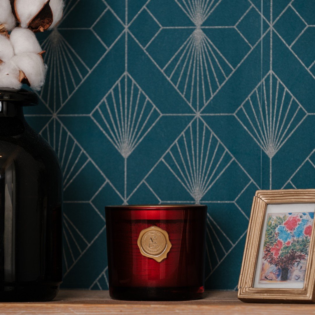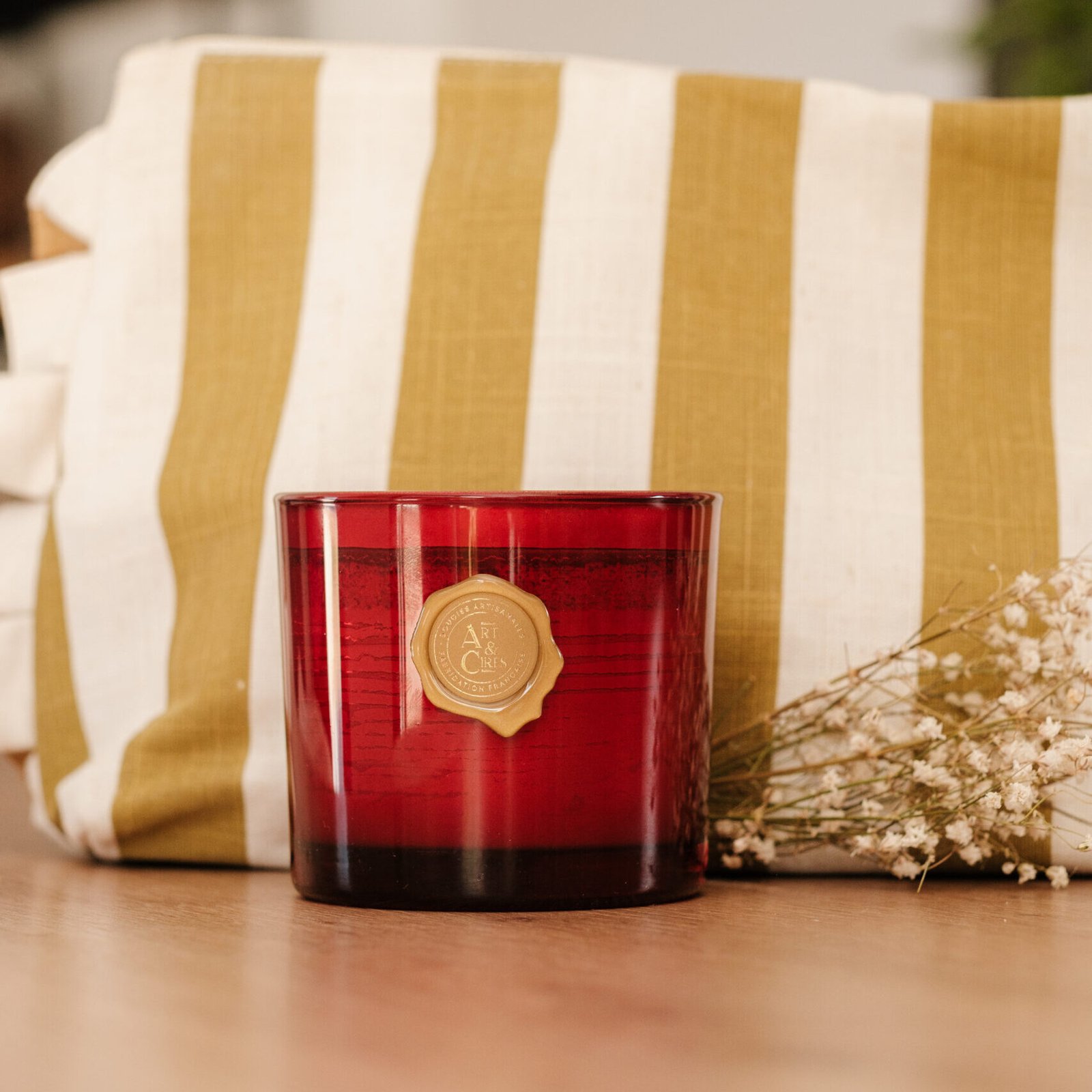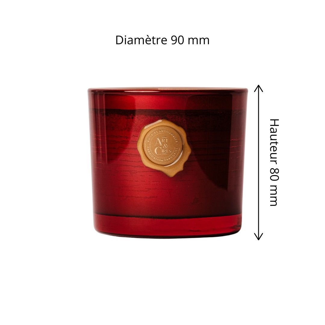 La bougie Passion se distingue par son verre laqué rouge profond, vibrant et élégant, sublimé par un intérieur vernis or qui reflète la lumière avec éclat. À l’allumage, la flamme crée une atmosphère chaleureuse, envoûtante et pleine de caractère.